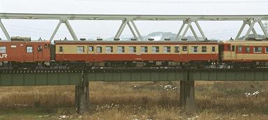 昔,国鉄のローカル線用気動車のボディーカラーは, クリーム色と朱色のツートンが標準だった.